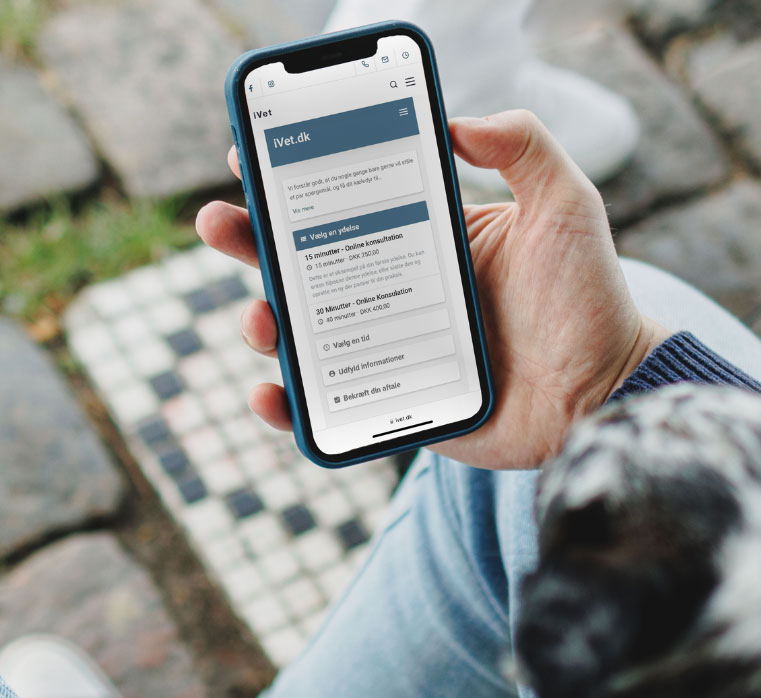 Det er hurtigt og enkelt at booke en online konsultation hos iVet. Klik videre her og se trin-for-trin, hvordan du booker en tid, der passer dig.